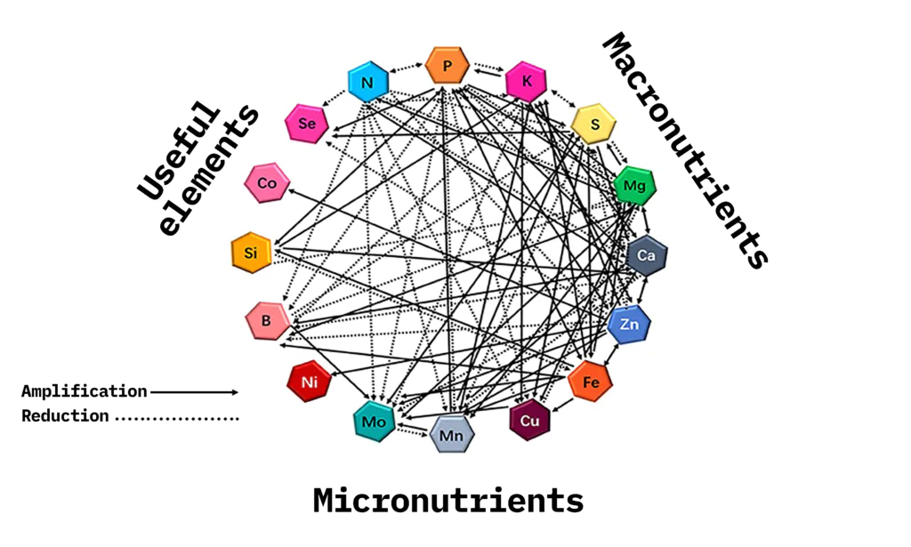 Providing maize plants with Si and/or Zn significantly reduces the concentration of Pi, K, Mg, Ca, Mn, Ni, and Co in roots. But increases the concentration of Se. The positive effect of the interaction of Si and Fe on the growth and productivity of vegetables and cereals has also been reported. Thus, the dynamics of the “functional ionome” of plants exposed to individual mineral deficiencies indicate the complexity and diversity of interactions between individual plant mineral nutrients. Overall, these ionomic analyses further confirm the emergence of complex cross-linking relationships between mineral nutrients in plants, indicating that under certain deficiencies. Cross-linking stimulates or inhibits the accumulation of other mineral nutrients, which changes the ionic composition of plant tissues.