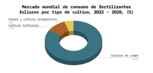 El uso de fertilizantes foliares está aumentando debido a la facilidad de aplicación (mediante métodos de pulverización foliar), que tienen una mayor eficacia de absorción. También puede darse el caso de que un elemento, aunque esté presente en el suelo en una forma disponible para las plantas, sea mal absorbido por las raíces debido, por ejemplo, a las bajas temperaturas. La necesidad de nutrición foliar también surge cuando se hace imposible el cultivo entre hileras, normalmente cuando el cultivo ha alcanzado una altura que no permite un cultivo y una fertilización de alta calidad. El siguiente gráfico circular muestra la cuota media de consumo mundial de abonos foliares por tipo de cultivo.