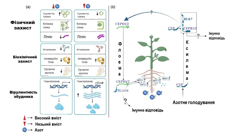 (a) Доступність азоту (N) різними способами впливає на захист рослин і взаємодію патогенів. Високий рівень азоту призводить до більшої соковитості тканин і тоншої клітинної стінки, та зниження вмісту лігніну. Це також впливає на виробництво захисних метаболітів, таких як фітоалексини, антимікробні білки та органічні кислоти, потенційно відбувається підвищення сприйнятливості рослин до патогенів і рослиноїдних комах. Крім того, вміст азоту регулює експресію патогенних ефекторів і вірулентність з N-голодуванням стимулюючи гени, пов’язані з патогенністю.